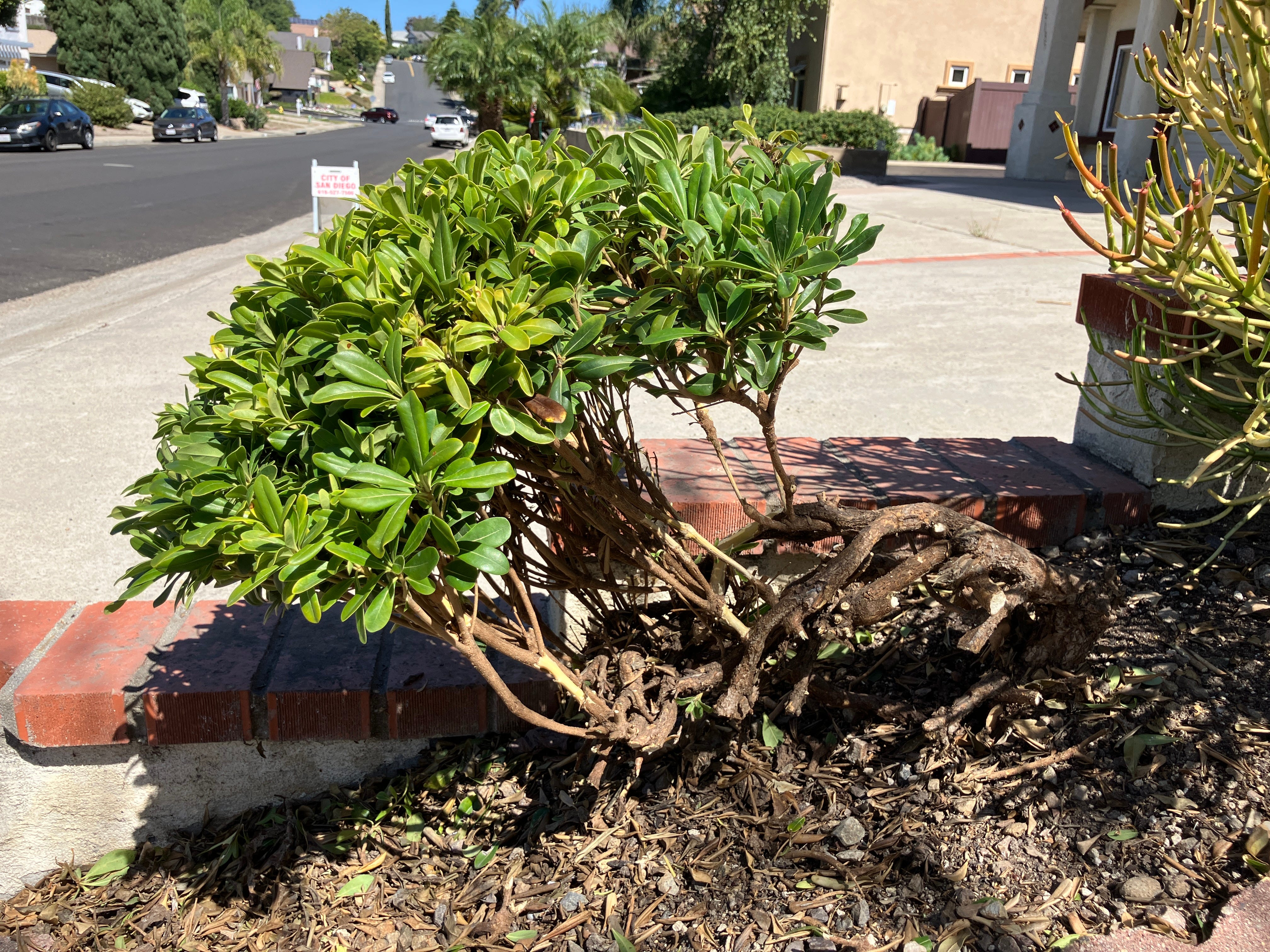 When one has a new set of scissors, every plant in the garden suddenly seems to have bonsai potential. I began to notice amorphous bushes, such as the one lining my walkway. I tried my hand with the one closest to the pavement, and snipped away.