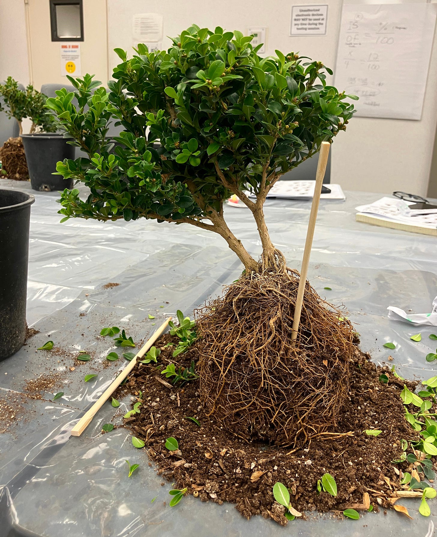 I repotted the plant with bonsai soil and food. I decided to tilt mine so that the leaves cascade to one side. I enjoyed the class. In the spring, we will return with the same plant to learn about wiring and training the branches.